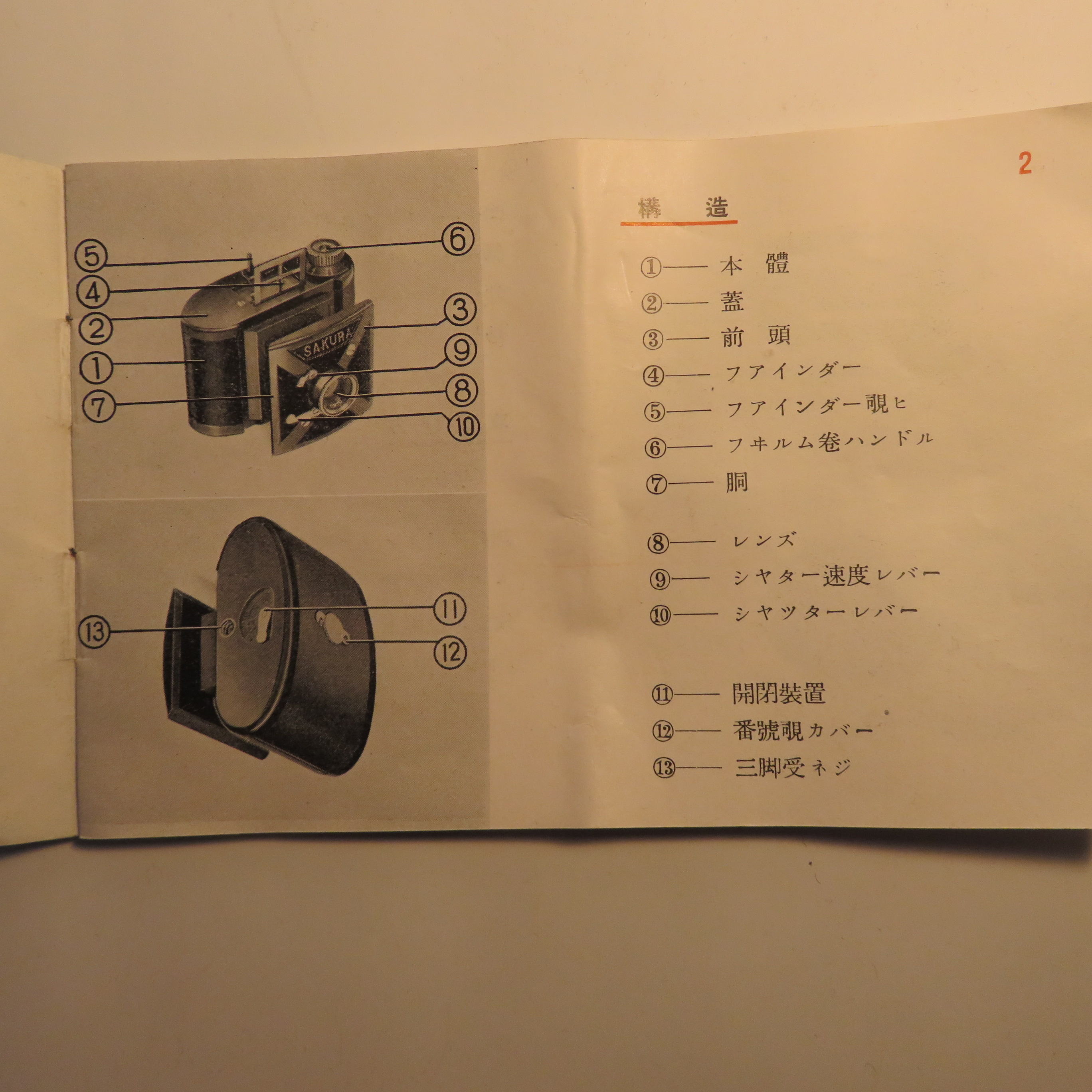 六櫻社 さくらカメラ 小西六から1937年に発売された初心者向けのシンプルなベークライト製の畳み込み式の小型カメラです。シャッターはIとBの二種類だけで、エバーセットタイプで、絞りは固定になっています。撮影するときはまず前板を引き出して、カメラ底部のロックを解除して、軍艦部を引き上げると中枠が抜けます。フィルムを入れて中枠を元に戻してロlルクを掛けます。巻き上げはまず赤窓に1を出して、巻き上げノブの根元の数字を1にします。撮影したら一回転させてから2まで巻き上げます。此を繰り返して10枚撮影できます。レンズ周りには”ROKUOH-SHA TOKYO”とありますが、焦点距離や明るさなどの表示はありません。 下記は、取扱説明書中の六櫻社 さくらカメラの各部名称です・ |
